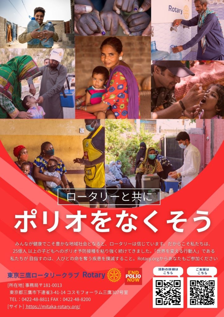 公益財団法人三鷹国際協会では、市民の皆さんが国際交流を楽しみながら、三鷹国際交流協会をより多くの人に知ってもらうことを目的に、三鷹国際交流フェスティバルを開催します。一日で気軽に世界が感じられるイベントです。当クラブでは、『ポリオ根絶』についての活動を皆さんにお伝えし認知していただきたくブースを出店します。当日は全員『赤いTシャツ』を着用してますので、是非ブースへお越しください。